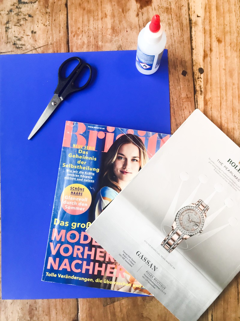 Oude magazines, papier met patroon print, karton/papier, lijm, schaar