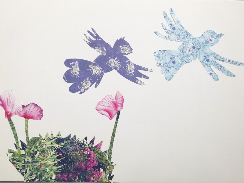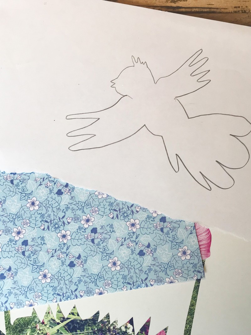 - Teken op de achterkant van een vel patroonpapier een figuur (vogel, hartje, bloem..) en knip deze uit.