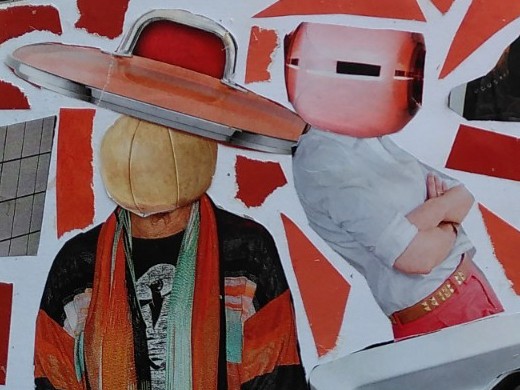 Jody gebruikt in zijn mozaïek ook collage. Dat is knippen en plakken met schaar en prit waarmee je nieuwe combinaties kunt maken. Niets is meer wat het lijkt. Een schilderskwast en een man zijn even groot, een pannendeksel is een hoed, doperwten zijn een vierkant.