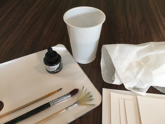 Een paar vellen wit papier (ik gebruikte 200-grams papier), een pallet of schoteltje, flesje zwarte ecoline, oude krant, stuk keukenpapier, en ten minste één waaierpenseel (ze bestaan in verschillende formaten en beharing) een pot met water.