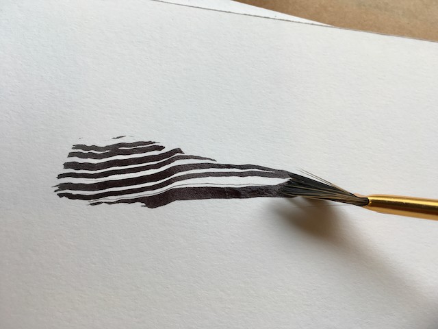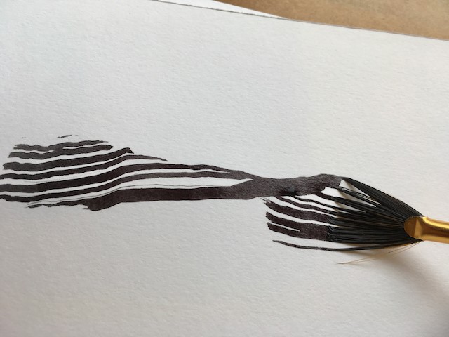 Zet de penseel met allen haren op papier en trek de penseel met ecoline een klein stukje over het papier: