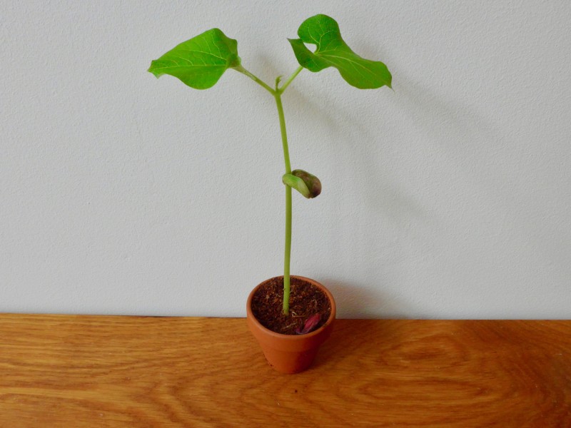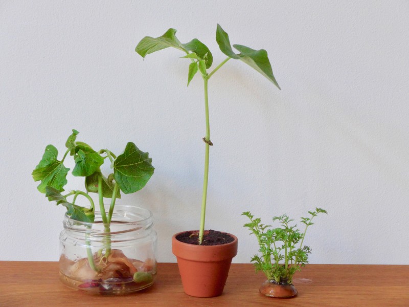 - Als de bonenplant wortels heeft en blad heeft gekregen zou je hem in een potje aarde kunnen zetten, of in de tuin.