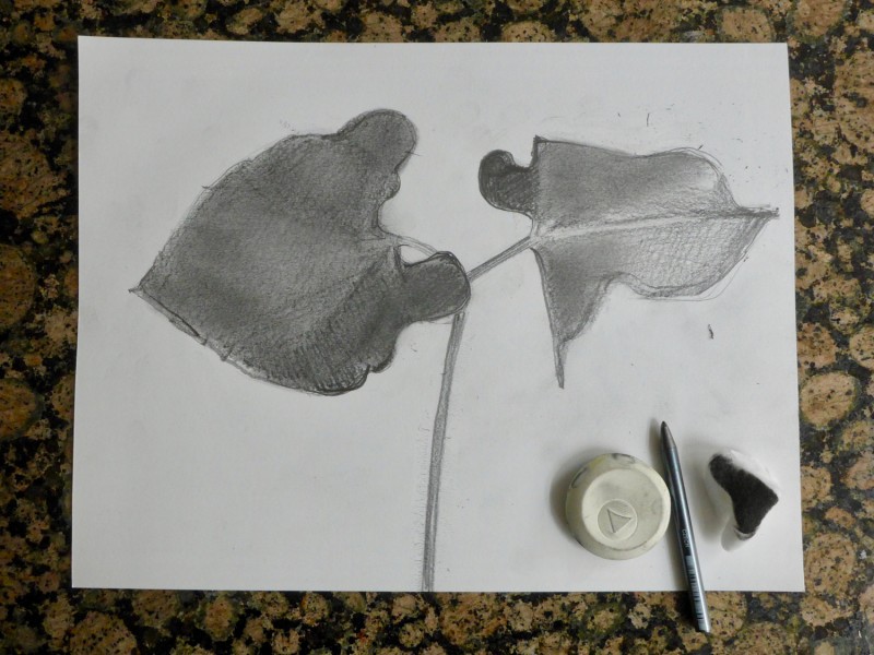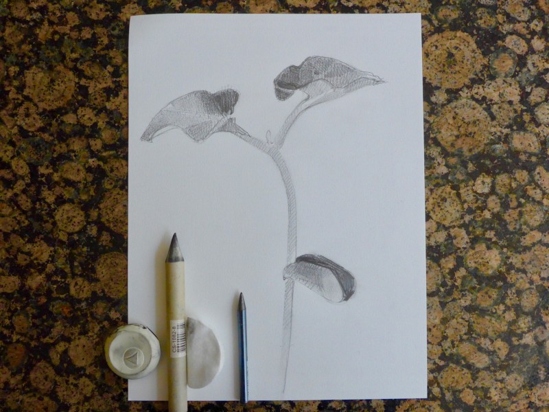 - Begin je tekening met dunne lijnen. Als je tevreden bent kan je die lijnen steviger maken en de volumes inkleuren met grijstonen. Arceren, gummen, vegen met je vinger, watje of doezelaar.