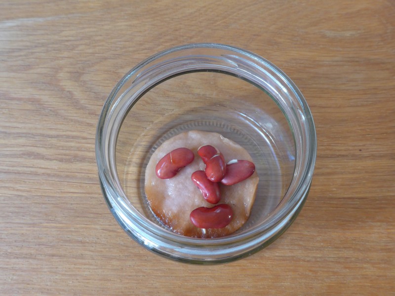 - Leg de rauwe, gedroogde boon tussen twee watjes in een glazen potje.