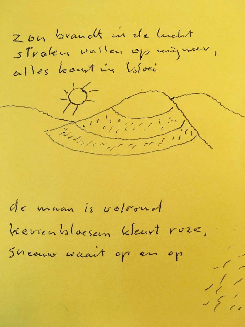 In één van de HVO-Querido-ateliers waar ik werk, wordt veel gedicht en geschreven. Kitty schrijft haiku's over de natuur en maakt er illustraties bij. Ze houdt zich aan de klassieke opbouw van de haiku.