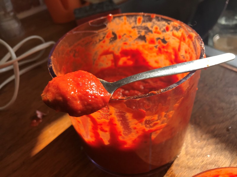 6 rode pepers, ca. 50 ml olijfolie, 1 blikje tomatenpuree, 2 knoflooktenen, ½ tl. zout, 1 el. komijnzaad, 1 tl koriander