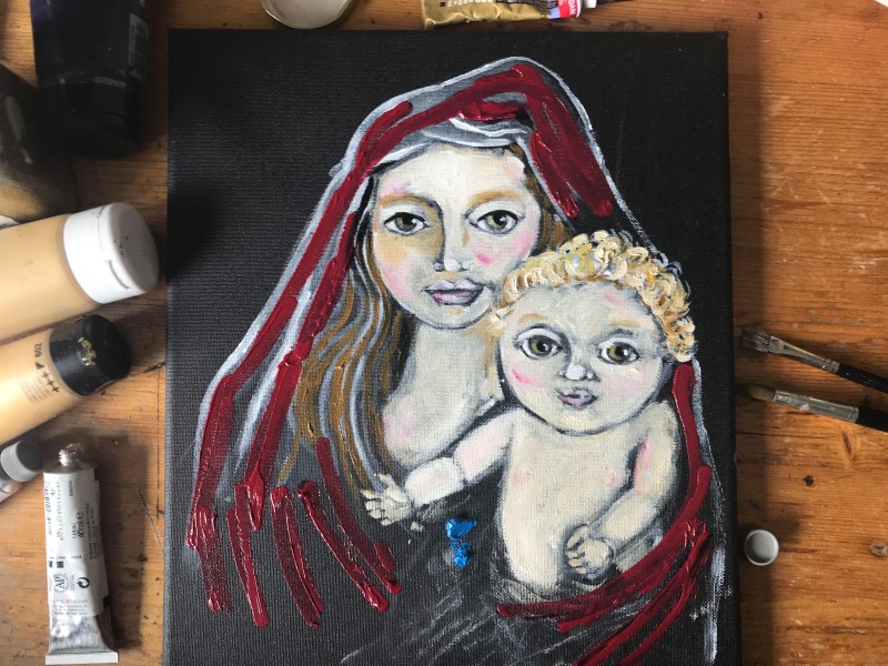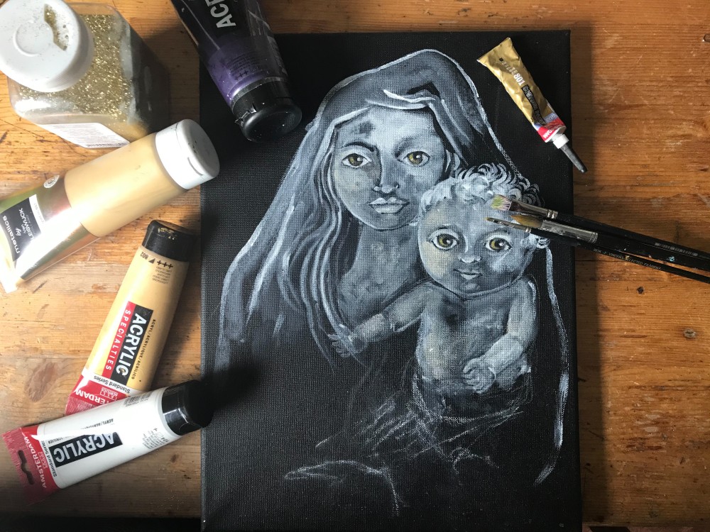Ik ben een ekster en hou van alles wat blinkt. Iconen schilderijtjes passen dan ook helemaal in mijn verzameling van bling bling voorwerpen. Het schilderen van iconen is ingewikkeld en er zijn regels aan verbonden, maar wij houden ons er niet aan. Schilder een of twee figuren en versier alles eromheen met goudverf, goud 3D-verf, goudpoeder.. ;-)