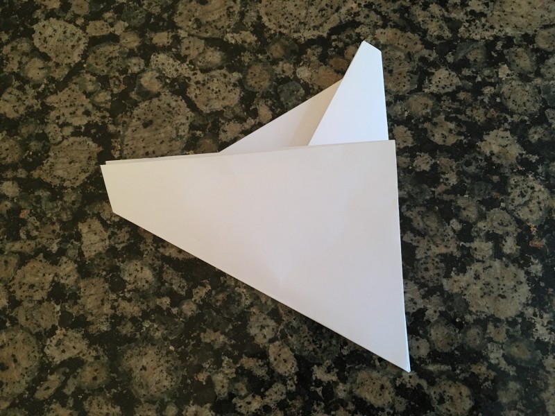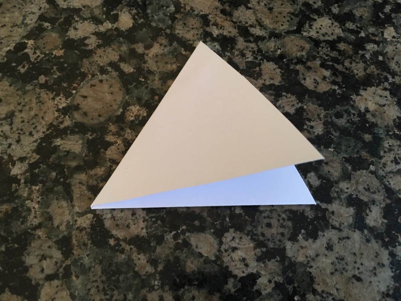 - Haal de driehoek weg en vouw de tegenoverliggende vouw net zo. Nu lijkt het een frietzakje.
