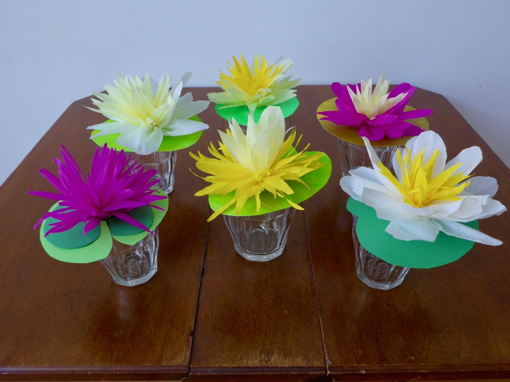 Waterlelies zijn er in allerlei tinten. Met crêpe-papier kan je het zo bont maken als je durft. Probeer maar uit, alles kan.