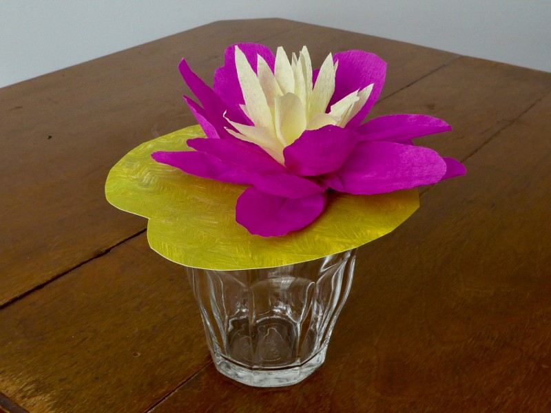 Crêpe-papier in verschillende tinten, schaar, potlood, dun ijzerdraad (de sluitstrips van de vuilniszakken zijn ook goed0, lange sate-prikkers, prit stift (vloeibare lijm laat het crêpe-papier vlekken), een vaasje of drinkglas om de waterlelie op te leggen (geen water geven!)